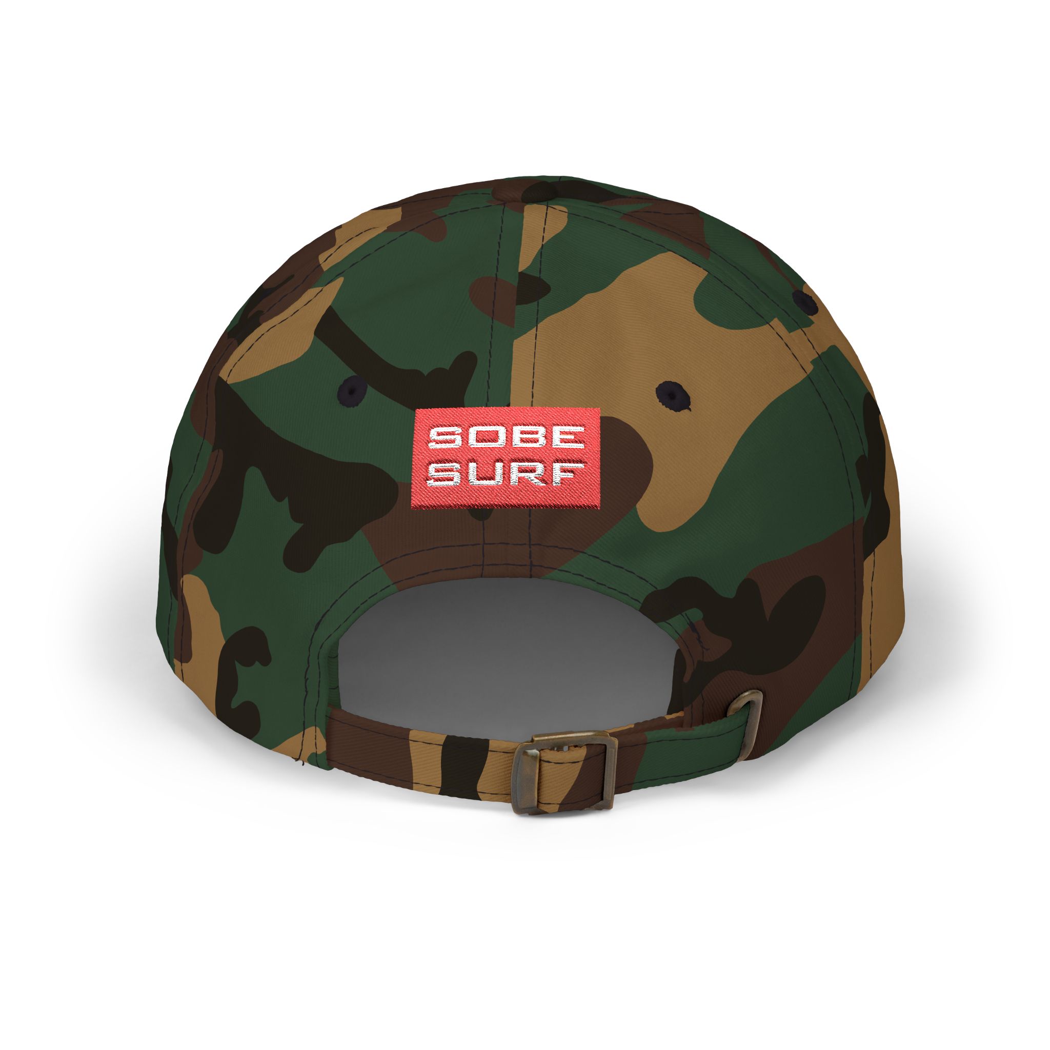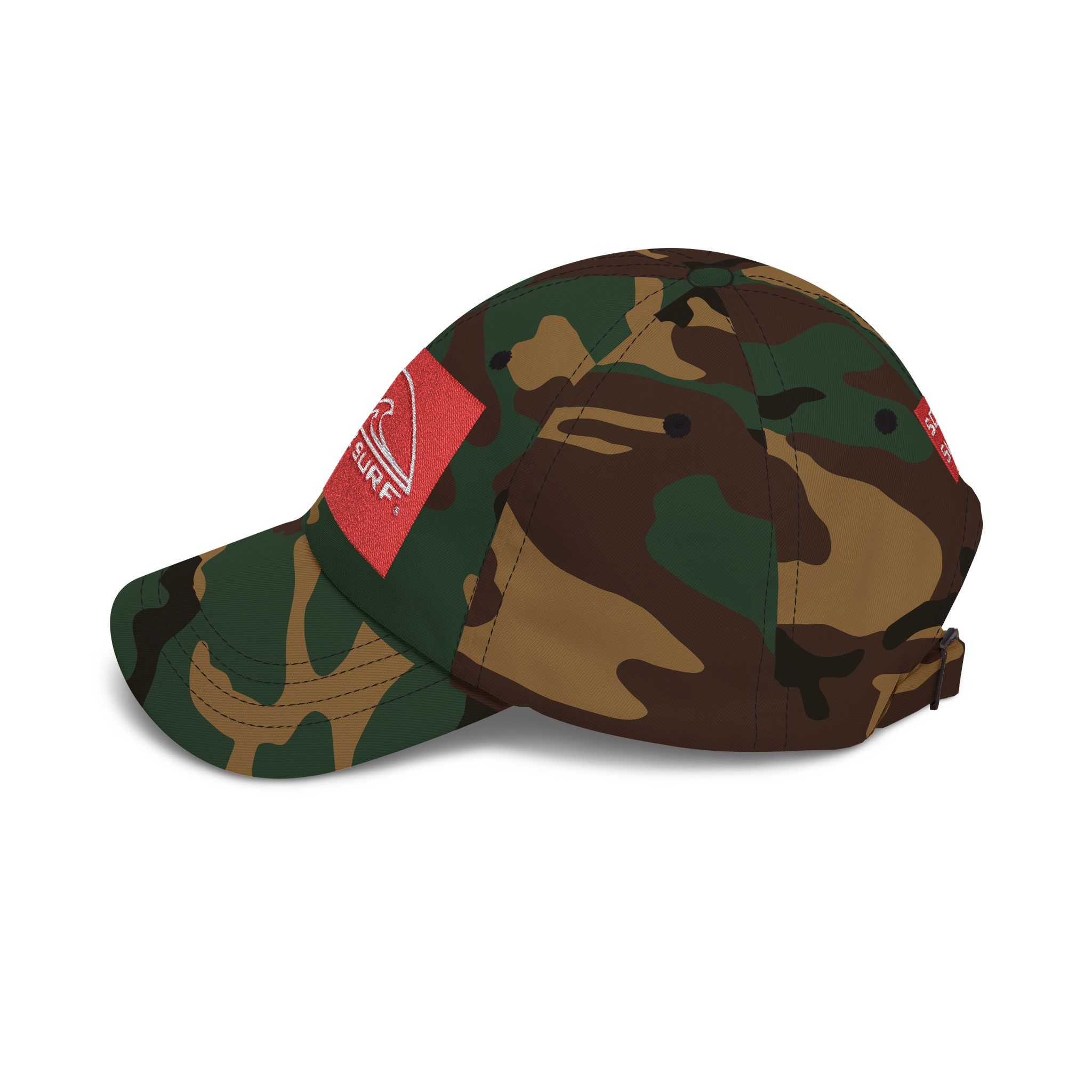 This camo cap brings slow-sun mornings on the shore into everyday wear. The low-profile, unstructured crown and pre-curved Permacurv® visor sit softly above your eyes, while the muted woodland pattern keeps the hat grounded and quietly rugged. A textured red patch with a simple wave logo adds a surf-squad pop against the earthy camo. The hideaway self-fabric strap with an antique brass buckle lets you fine-tune the fit, and small details — sewn-in label and brand sticker on the visor — give it an authentic, well-loved feel. Wear it driving down coastal backroads, packing the cooler for a sunrise session, or running weekend errands when you want to look lived-in without trying too hard.